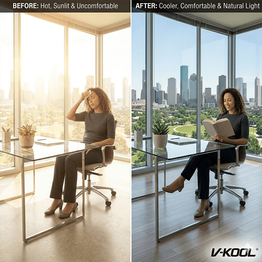 V-KOOL blocks 65% of solar heat and 99% of UV rays — top-rated by independent NFRC testing — while your views stay clear.